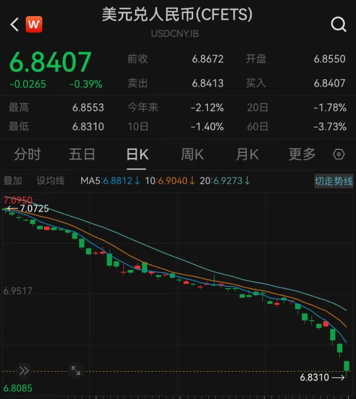 自2025年4月上旬以来,在岸人民币对美元在波动中整体持续升值,至2025年底升破7.0关口,并于2026年春节前升破6.9。2月26日,在岸人民币对美元盘中报6.8370,已升破6.85,截至发稿,2026年累计升值幅度超过1400点。
