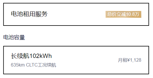 以2026款ES8六座行政签名版为例,采用车电分离模式,车价可以降低10.8万,消费者只需月付1128元租金,就可以租用102kWh的电池包。