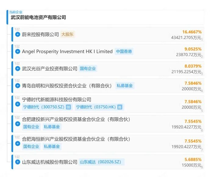 在成立之初,蔚来、宁德时代、湖北科投和国泰君安四大创始股东陆续共出资8亿元(笔者:首轮融资有多种说法,本文采信山东威达的公告)。当年底,就有产业资金、金融机构参与投资,包括其供应商山东威达。