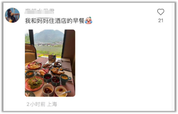 这个人表示自己和妈妈在外面酒店吃得可好了,然后晒了一桌子菜的图: