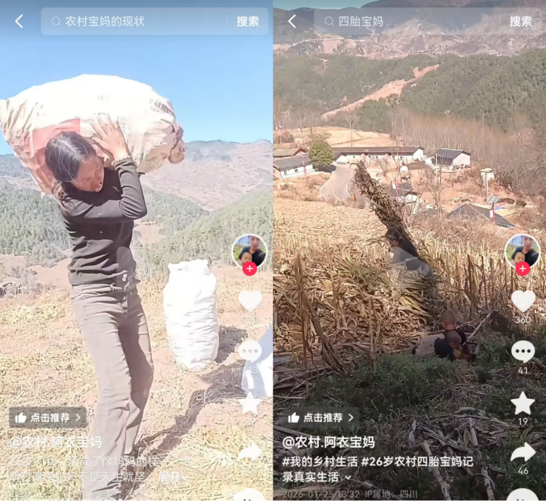她喜欢在抖音上分享生活,扛扛化肥袋,收拾桔梗这些。年幼的孩子待在一旁。