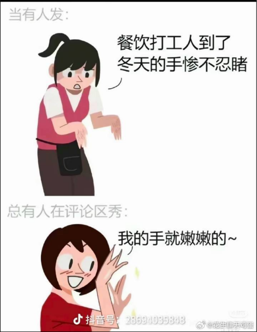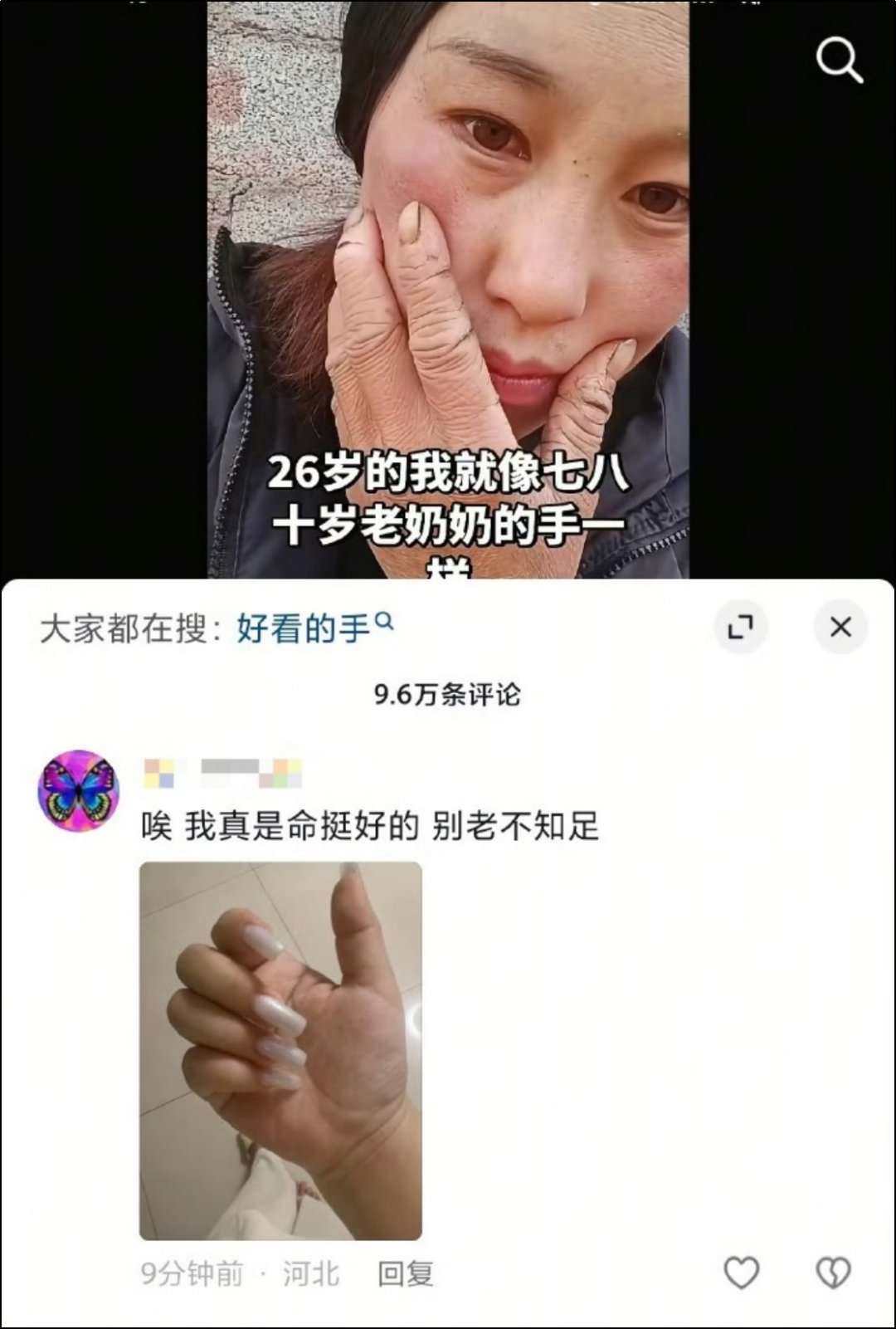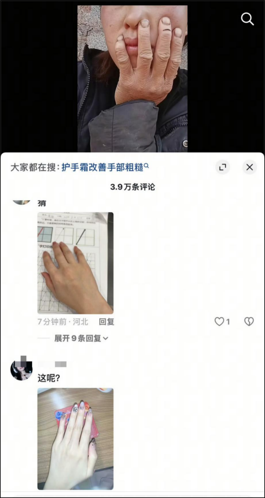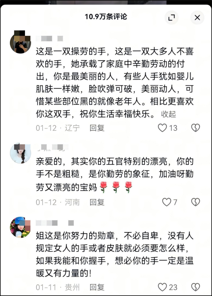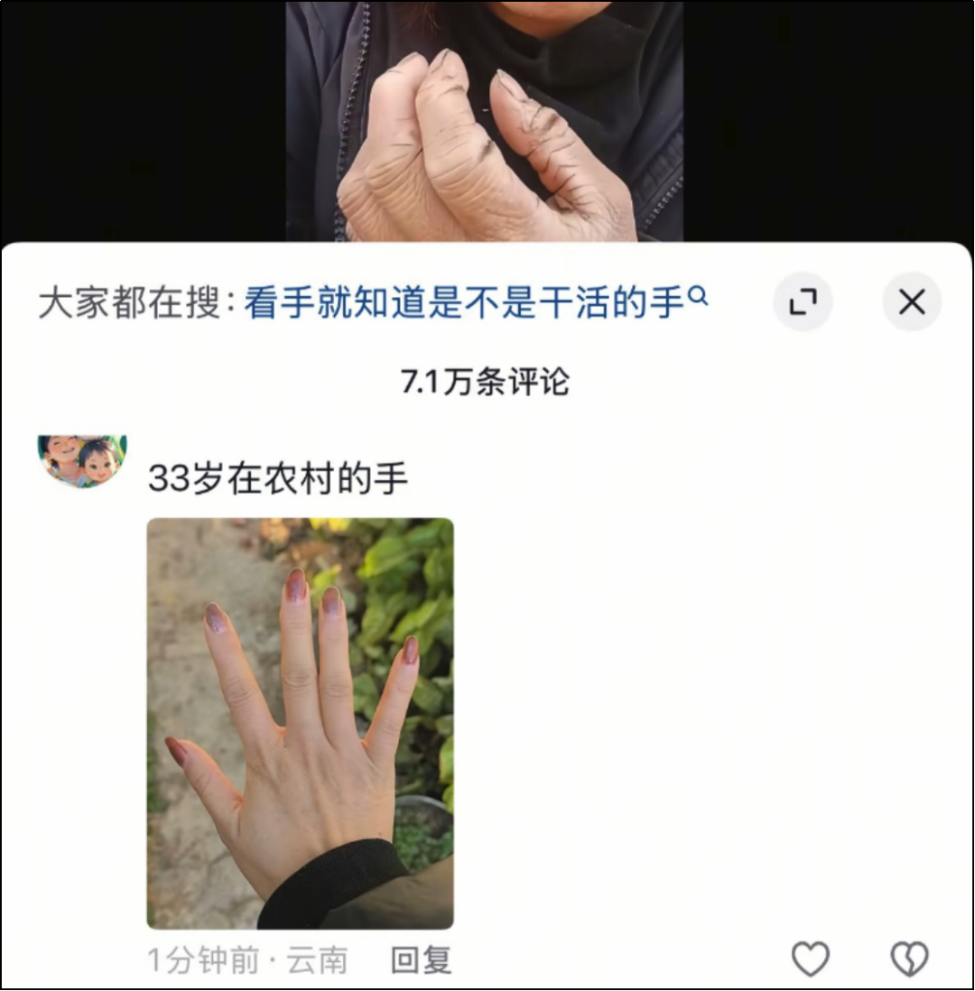 总有人要在别人劳作后的老手照片底下,拿自己的纤纤玉手显摆。
