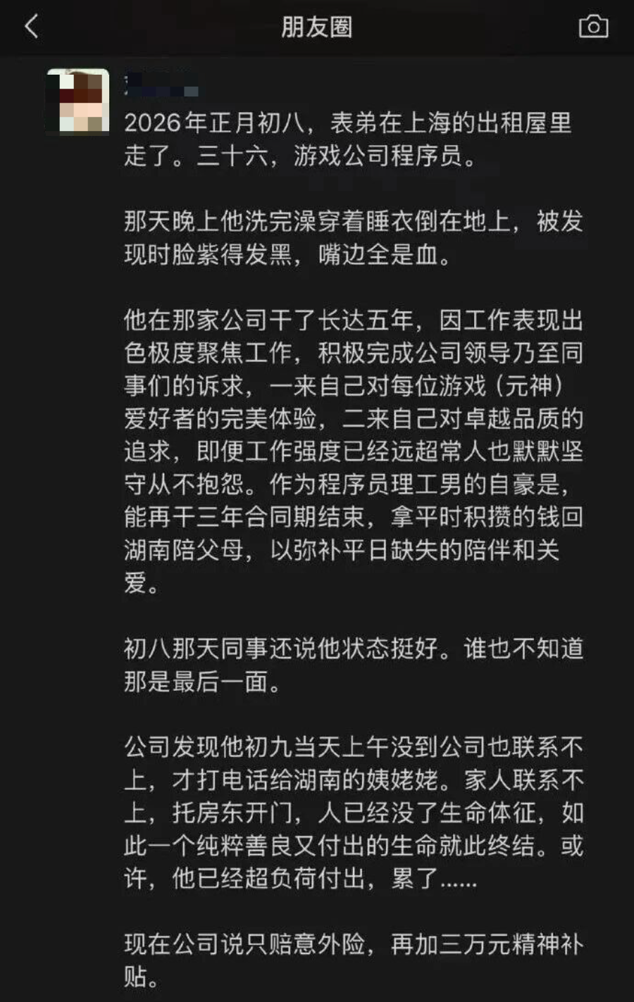 消息最初源于流出的一张,来自逝者家属朋友圈的截图,家属沉痛透露,自己年仅36岁的表弟于正月初八在上海出租屋内不幸离世。