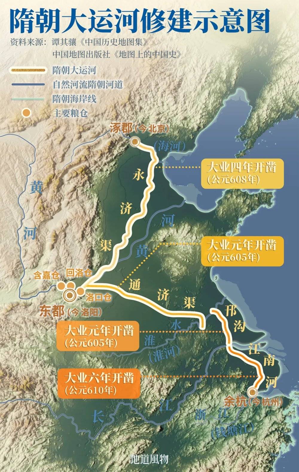 因此,炀帝将目光投向洛阳。洛阳地处天下之中,钱粮充足,转运灵便,是营建新都的不二之选。另外,大运河也可以说是洛阳的“配套设施”,因其南北交汇的节点就在洛阳,进一步使得江南运来的粮食与物资能够在此集散、储存。隋朝在建设这座新都时,特意在其周边修建了洛口仓、回洛仓、含嘉仓等一系列规模惊人的大型粮仓,其中仅含嘉仓一处,据考古推算即可储存粮食二十余万吨。