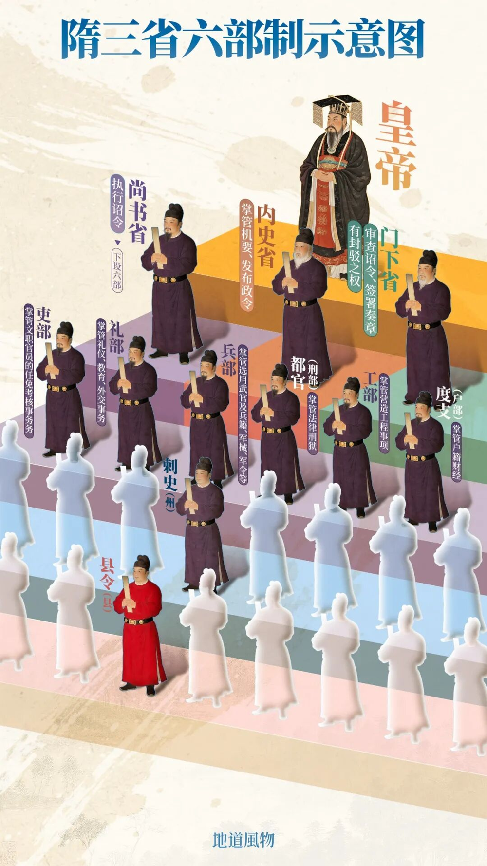 与此同时,隋朝还确立了一套分工明确、彼此制衡的中央决策与执行体系——五省六曹制,成为唐朝三省六部制的雏形。