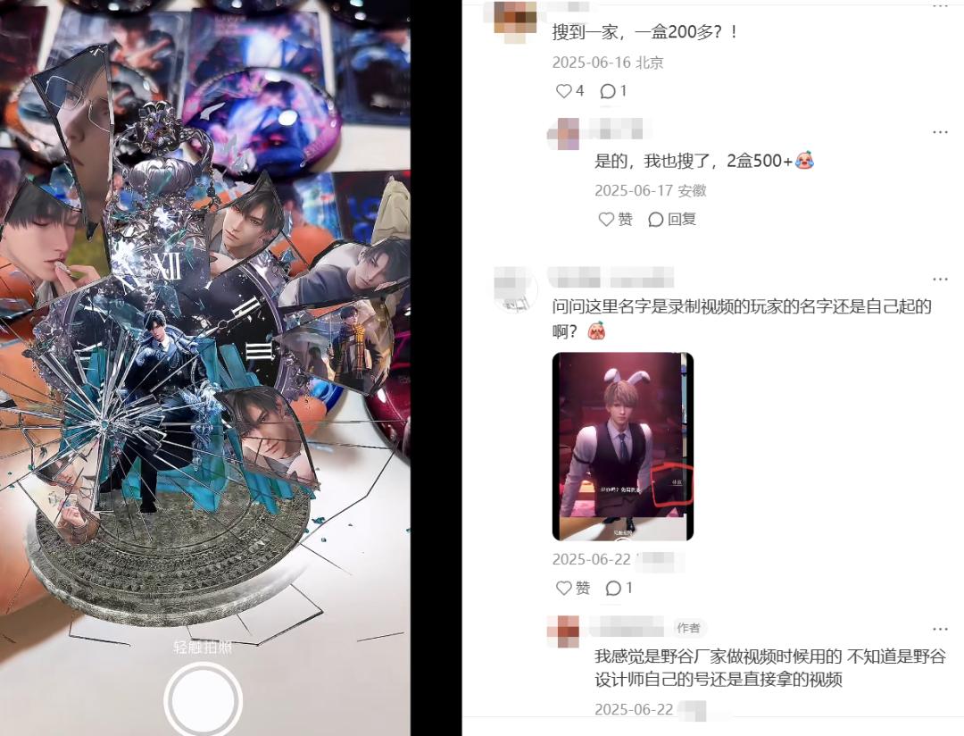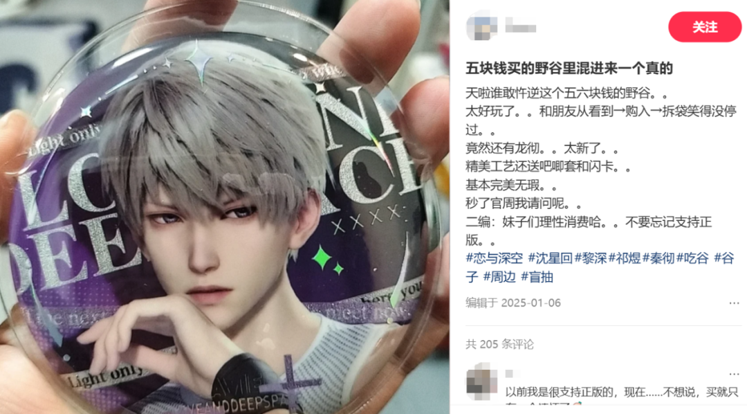 答案也很简单。这些“野周”没有经过设计、打样、调试等流程,品质全靠运气。打错名字、印错图层都是常事,甚至会出现一些圈内人视为禁忌的操作:小鱼打开一款乙女游戏“野周”的包装,发现设计师将两个男主硬塞进了同一个吧唧里,立刻觉得“五块钱也是钱”。