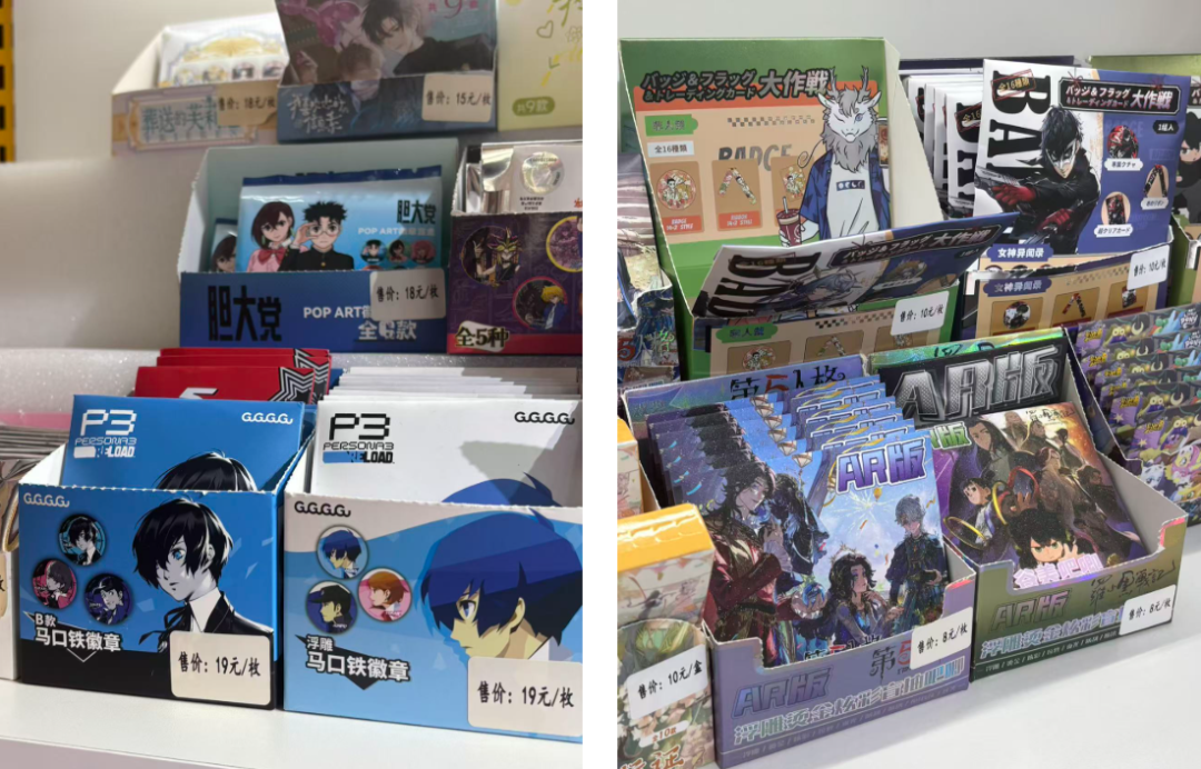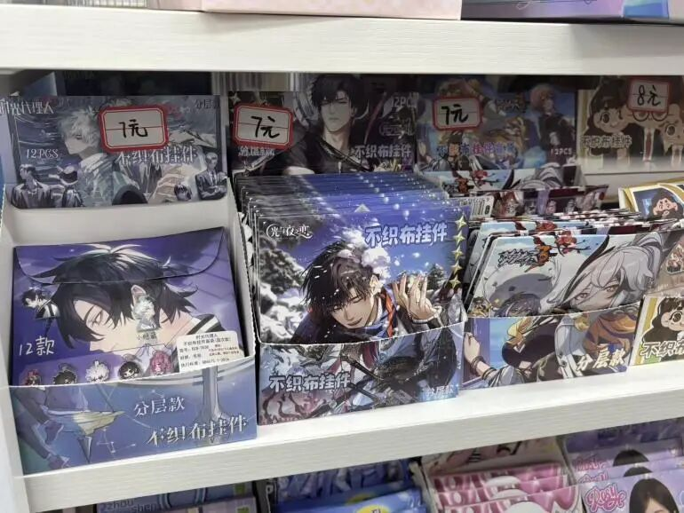 这些连锁精品店在县城呈现出明显集聚策略,几乎没有小店,而都倾向于在最大的几个商圈打通2~3个铺位保证人流。这些精品店也乐于在门口摆出谷子的货架,选品以国产小说、动画和游戏为主,较大门店还会有一些国内代理的日本ip。