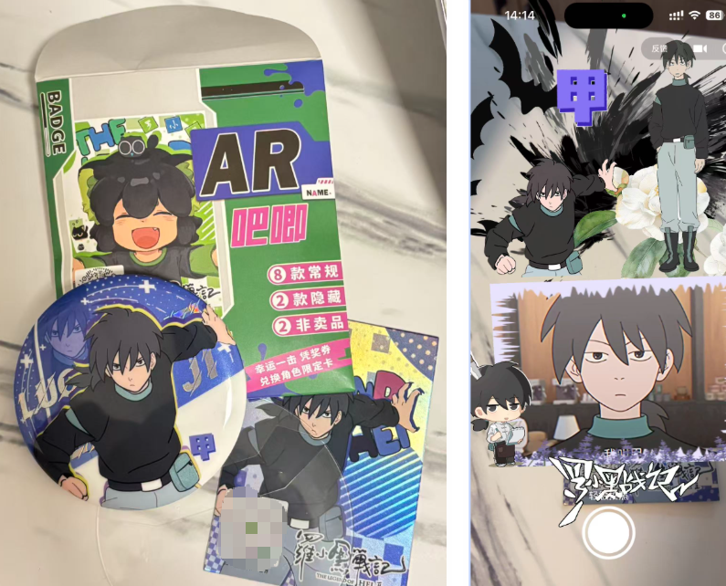 “野周”的“野”,原本是相对于官方周边的“野生”而言,但这些野周在内容上也“野得没边”。“野周”的价格通常在5~15元一抽,包装纸袋上的标识长得几乎写不下——浮雕烫金幻彩拉丝银葱限定珍藏动漫徽章,附赠光栅小卡、保护膜和抽奖券,还能扫出AR动画。