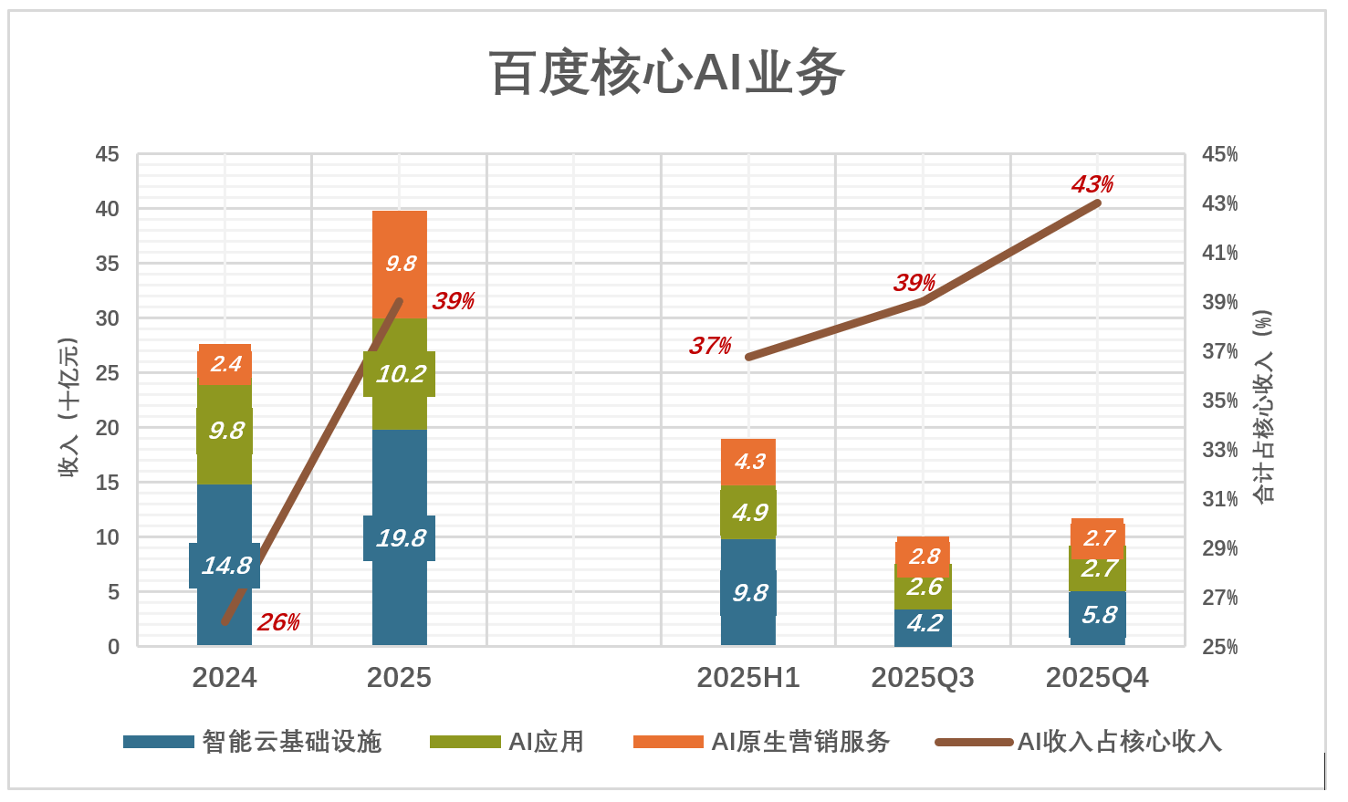 2025年三季报开始,百度推出“全新AI原生视角”,按照产品、服务与AI的关联程度对核心业务进行梳理——尝试绑定AI的归为“核心AI新业务”、正在“AI化”的归为“其他一般性业务”。