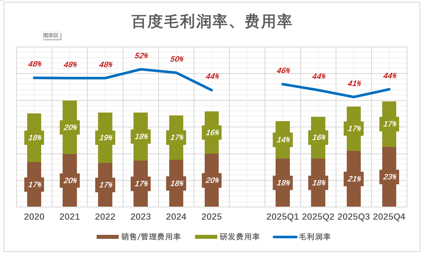 2025年,百度集团毛利润率降至43.9%,销售/管理费用率提高到20%,研发费用率降至15.8%;