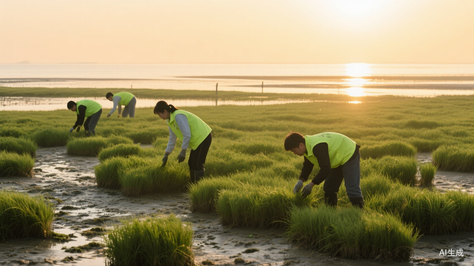 伴着初升的朝阳在滩涂上移植海草