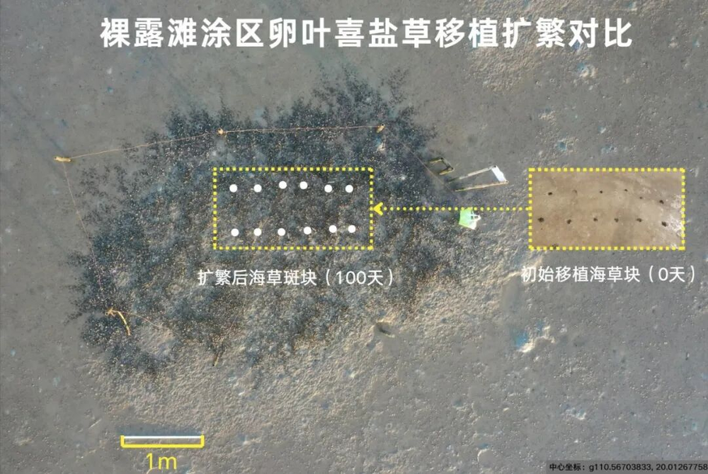 经过近一年的忙活,这片“试验田”有了不少令人欣喜的结果。通过摸底,我们看清了北港岛的海草家底:这里历史上曾有过5种海草,虽然曾经已有的日本鳗草和单脉二药草现在已经很难见到了,但我们移植下来的单脉二药草已经在北港扎根,围护起来的贝克喜盐草也持续扩繁,卵叶喜盐草更是肆意生长。以卵叶喜盐草为例,仅仅过了5个月,这些移植海草的面积就扩大到原来面积的近150倍。原本零星的小草块开始往外“窜”,渐渐长成了整片的“绿毯”。