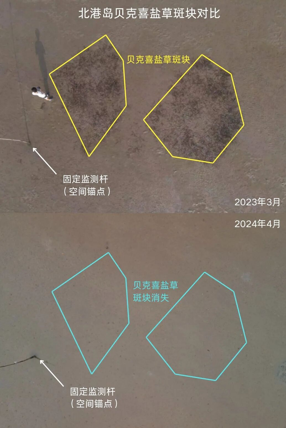 对比显示,相同点位的海草覆盖状况发生显著变化。
