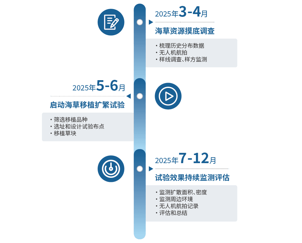 我们的工作主要分为三阶段:海草资源摸底、海草移植扩繁和效果监测评估。
