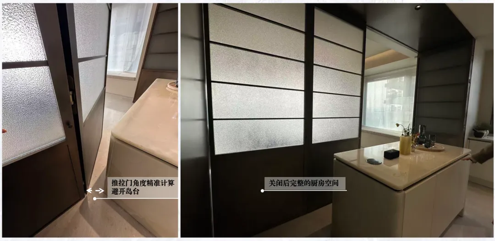 你会发现推拉门和岛台有恰到好处的空间预留,而合上门则严丝合缝