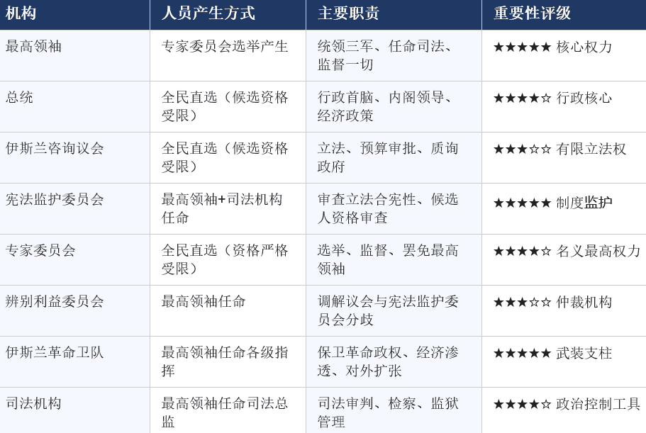 伊朗政治体制的核心设计逻辑是通过多层次的制度性过滤(候选资格审查、立法审核、司法控制),确保所有进入国家权力机构的人员在意识形态上对神权体制忠诚;同时通过保留选举程序,给不同政治倾向(保守派内部的强硬派与务实派,以及受到严格限制的改革派)提供了有限的政策博弈空间。