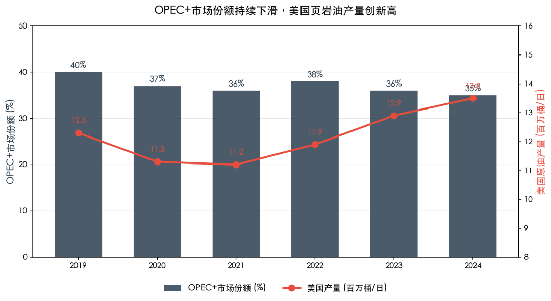 OPEC+过去三年累计减产约580万桶/日来维持油价,结果是:油价稳住了,但市场丢了。每减产一桶,就多一桶份额被美国页岩油和南美新秀填补。