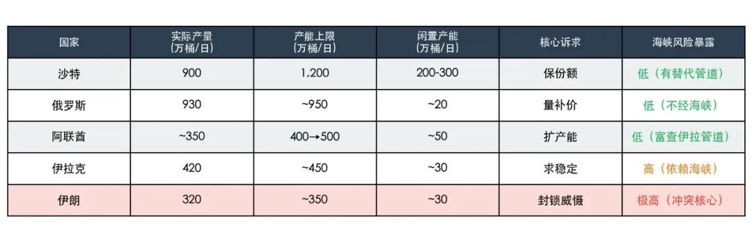 Opec+主要成员国的产能、产量和核心诉求