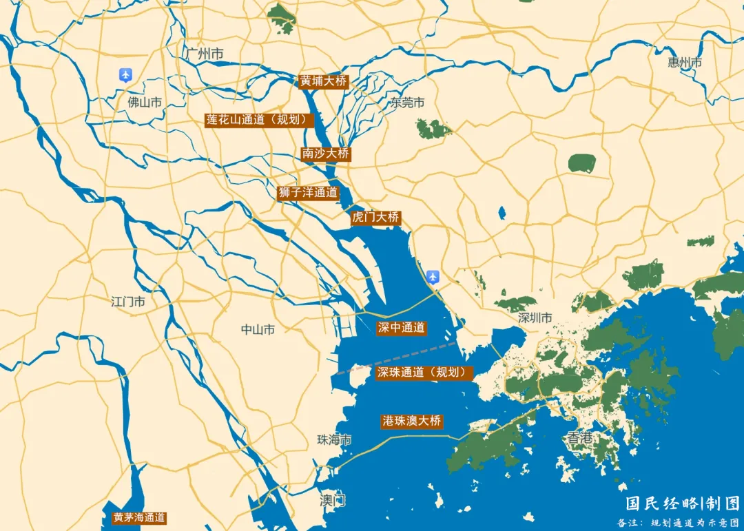 从硬联通来看,在珠江口,将有11座跨海大桥横贯其上,包括港珠澳大桥、深中通道、虎门大桥、南沙大桥,以及正在规划中的深珠通道,大幅压缩时空距离。