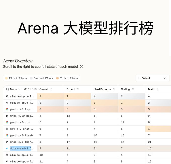 Doubao-Seed-2.0不仅拿下了国内综合第一,还在全球总榜里冲进了前10。其他几家新模型,GLM5、文心5、Qwen3.5、Kimi K2.5,紧跟着排在了16 17 18 19名。