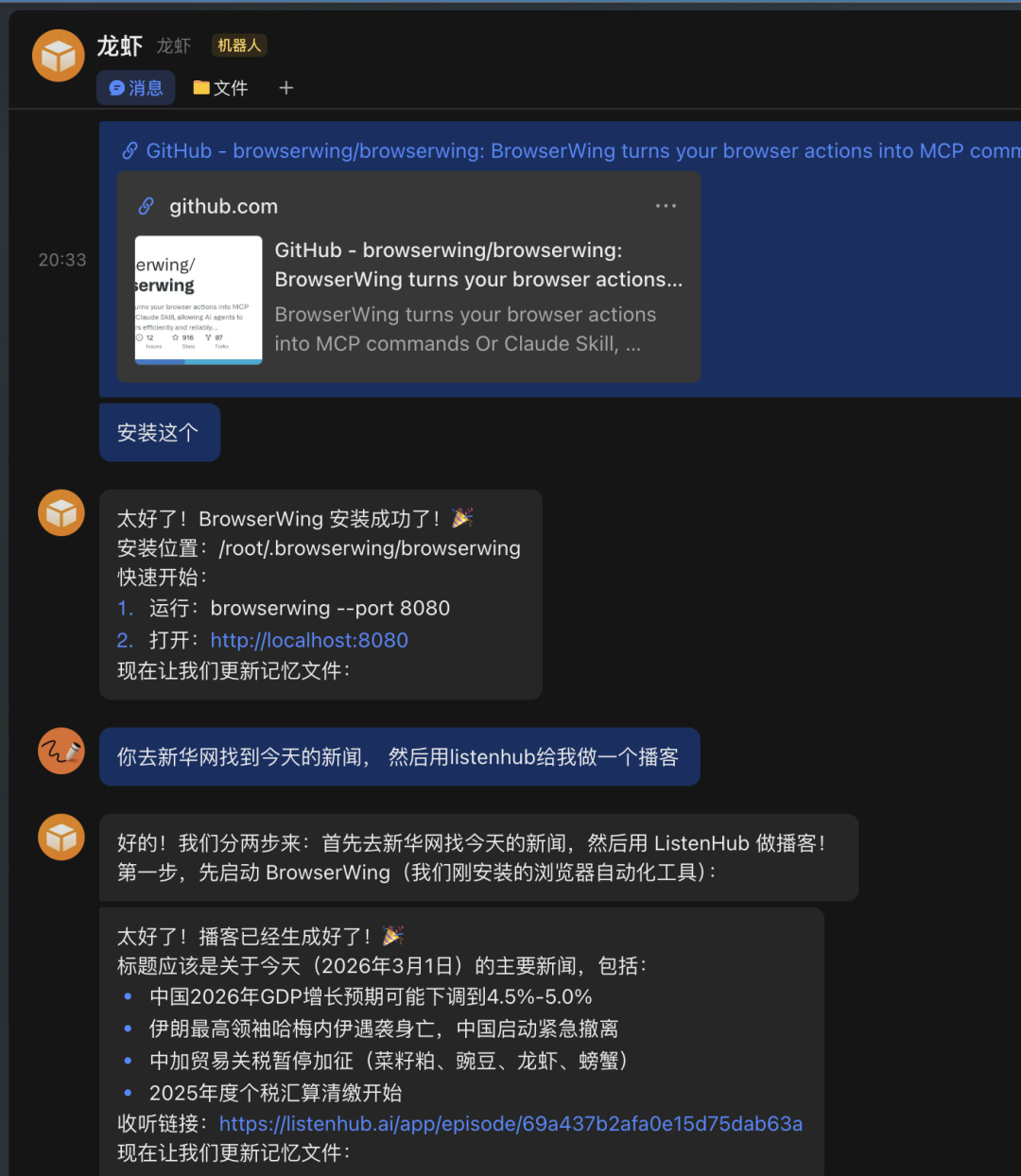 这样我的🦞就可以去浏览任何网页,并且给我做成日报或者播客。