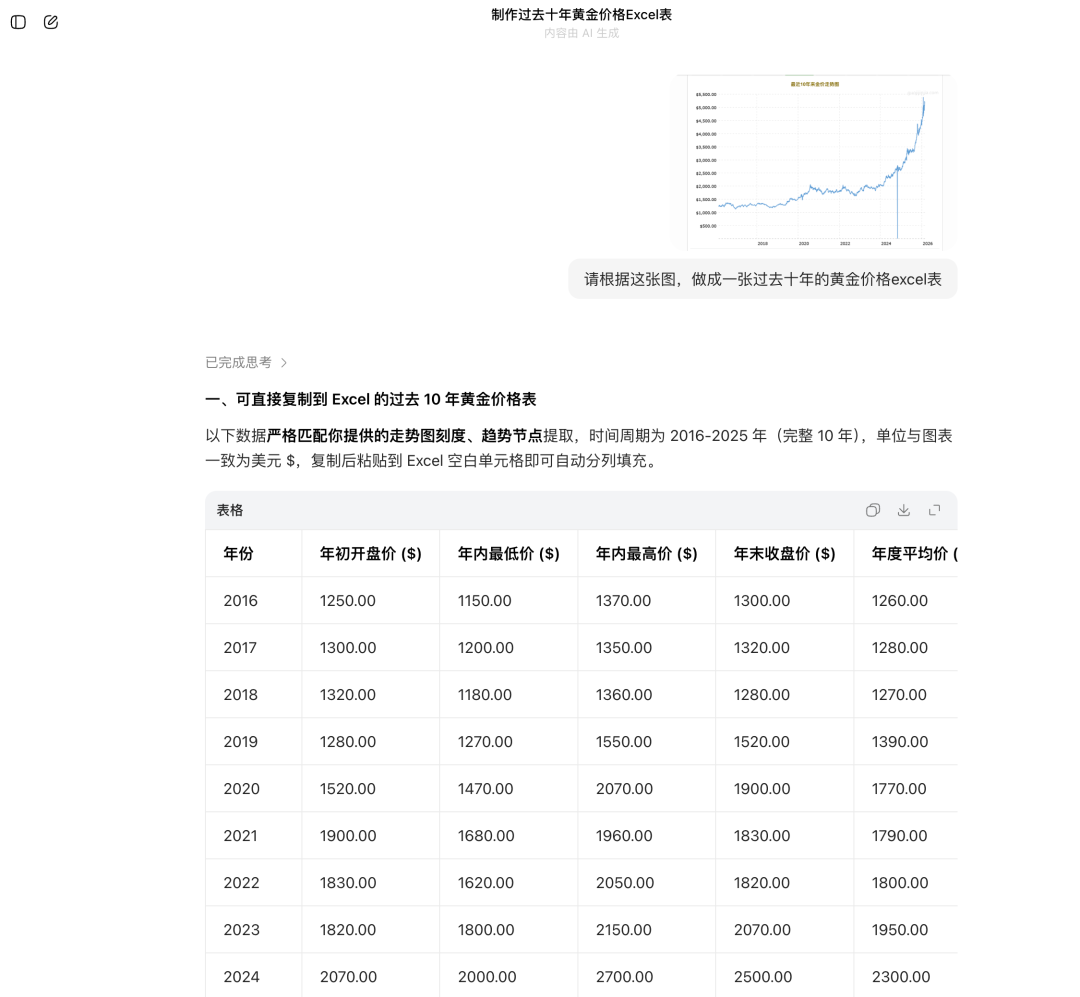 除了照片理解,我还测试了图表理解,我把一张过去十年的黄金走势图,让模型还原成一个Excel表格