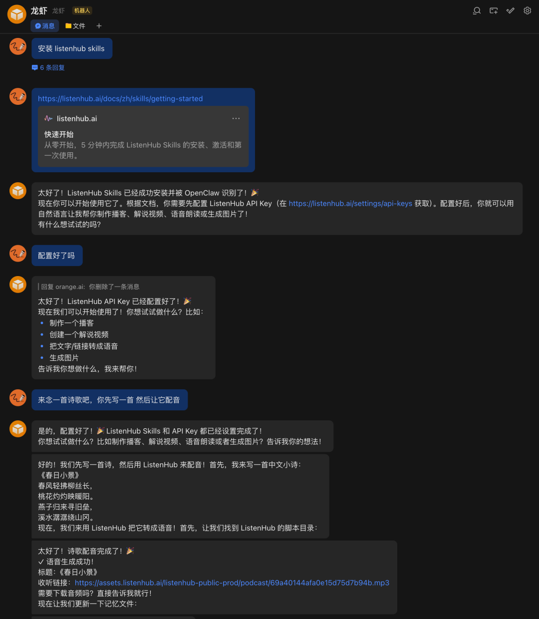 我先让它安装了我最常用的ListenHub Skill,用来给一些文稿配音,它一次就搞定了。