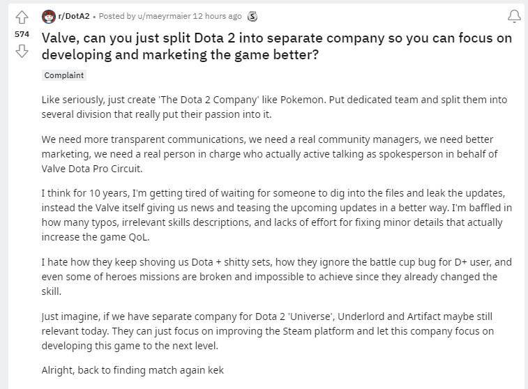 @3DMGame【国外玩家呼吁V社分拆,成立DOTA2单独公司】多年以来,V社又被刀塔玩家戏称为“度假社”,主要是因为玩家认为V社对于《DOTA2》的运营非常不满,做事情效率很低,而且和玩家之间缺乏沟通。玩家认为V社根本不知道玩家想要什么。有鉴于此,Reddit上一名玩家呼吁V社分拆,将DOTA2分成一家独立运营的公司“The Dota 2 Company”,就像《宝可梦》一样。
