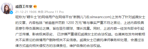@界面新闻【戚薇工作室回应:“被追缴并罚款 1200 万元”为严重不实言论】微博12月21日声明,昵称为“鞭牛士”的网络用户在网络平台“新腕儿”上发布了针对戚薇的文章,内容包括“被追缴并罚款1200万元”等与事实严重不符之言论,上述内容极具恶意引导负面舆论之嫌,旨在吸引眼球、增长流量。戚薇已委托律师事务所处理,会通过法律方式追究相关侵权方的法律责任,维护自身的合法权益。