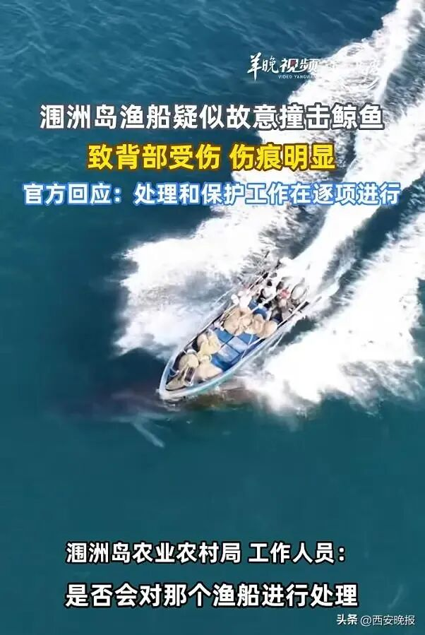 2月7日,广西北海市涠洲岛的观鲸游客目睹了可怕的一幕:一艘渔船从一头布氏鲸的背上驶过,在它背上留下50~60厘米长的伤口。伤鲸编号为WZ-056,绰号“刀疤哥”,因为在此之前,它身上就有被螺旋桨打伤的疤痕。