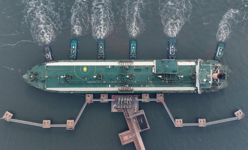 2023年,来自卡塔尔的“阿尔达夫那”号LNG轮在拖轮的协助下,向唐山港曹妃甸港区中国石油唐山LNG接收站码头靠泊(图源:新华社)