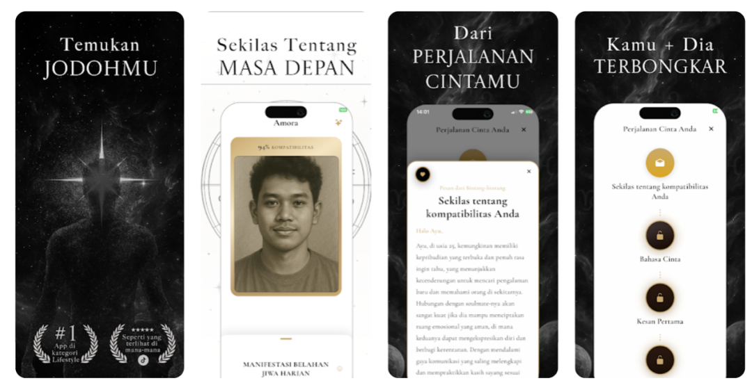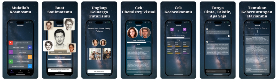 但扒了一圈社媒上关于Amora的内容发现,绝大多数社媒内容所呈现的App界面都是流水较高的「Amora:Belahan jiwa kamu」,语言基本是印尼语、越南语,也有少量西语和葡语内容,形式更像我们之前观察过的Web端占星产品Hint,而非Starla,核心目的是让用户相信,用Amora可以找到Soulmate(关于Hint可参阅之前的文章《借移动端的“凉梗”流量增长150%,这家AI占星网站一年收入过千万》)。