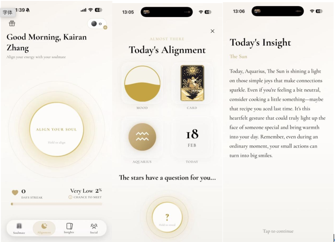 打开第2个标签Alignment是一个“每日签到”功能,用户需要按住中间圆圈,并持续几秒钟来“对齐灵魂”,通过仪式感,来增加用户的心理投入。而屏幕下方则会呈现连续打卡天数和遇见Soulmate几率两个数据,几率可以通过每日打卡提升,传递一个核心理念“你坚持得越久,越接近Soulmate”。