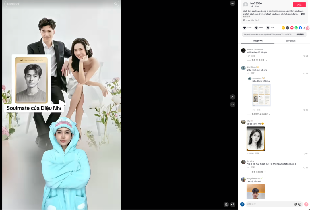 TikTok平台上,Amora相关的内容基本都是“真人出镜+Soulmate+关系验证”的模式。比如上图中,就是真人女生、对应男Soulmate,并配以结婚照,文案上则平铺直叙,“这是我的Soulmate”,强烈暗示Soulmate“照进现实”。
