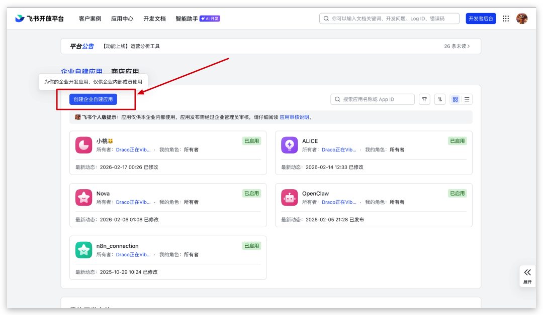 创建企业自建应用。