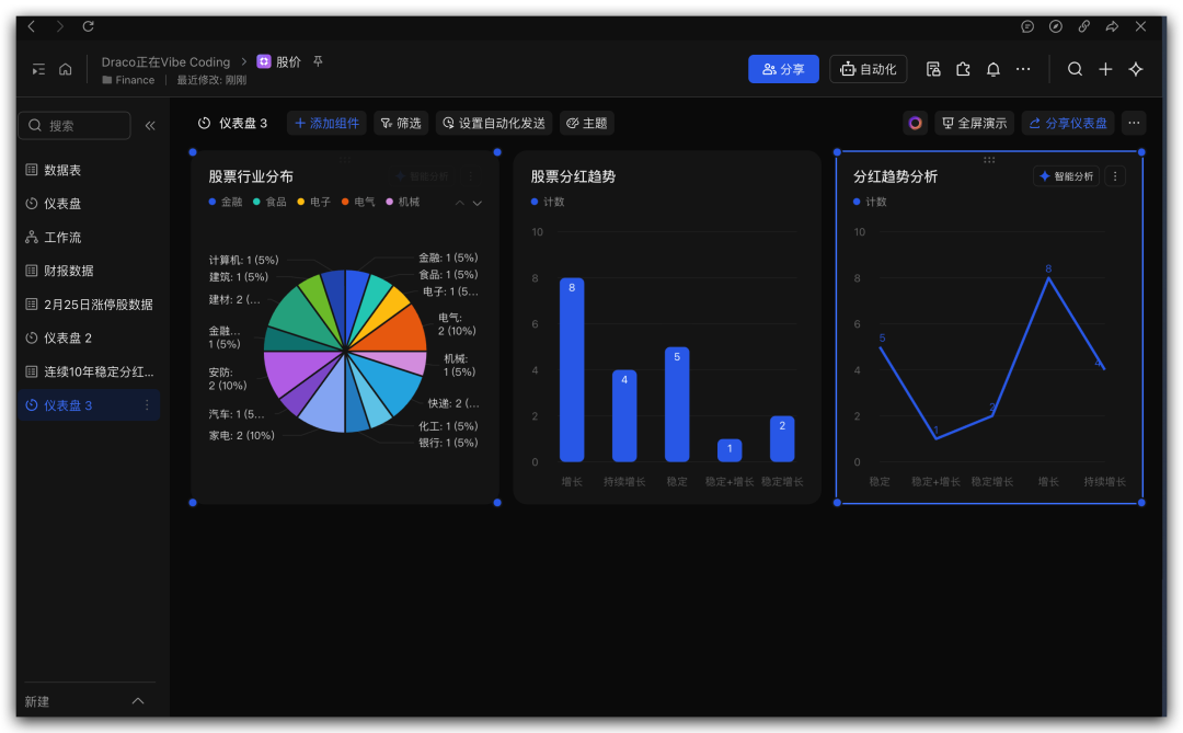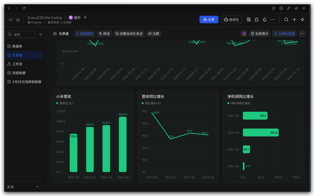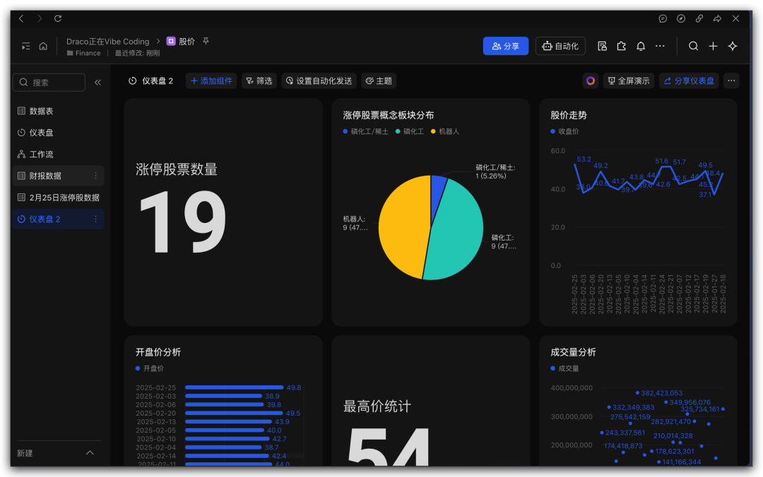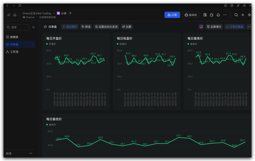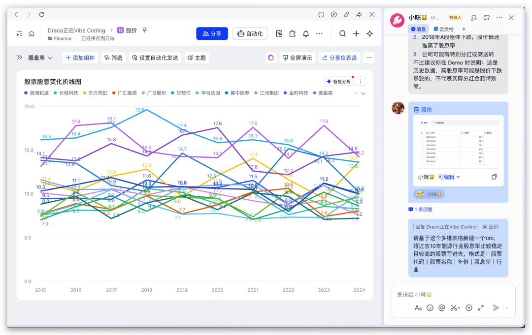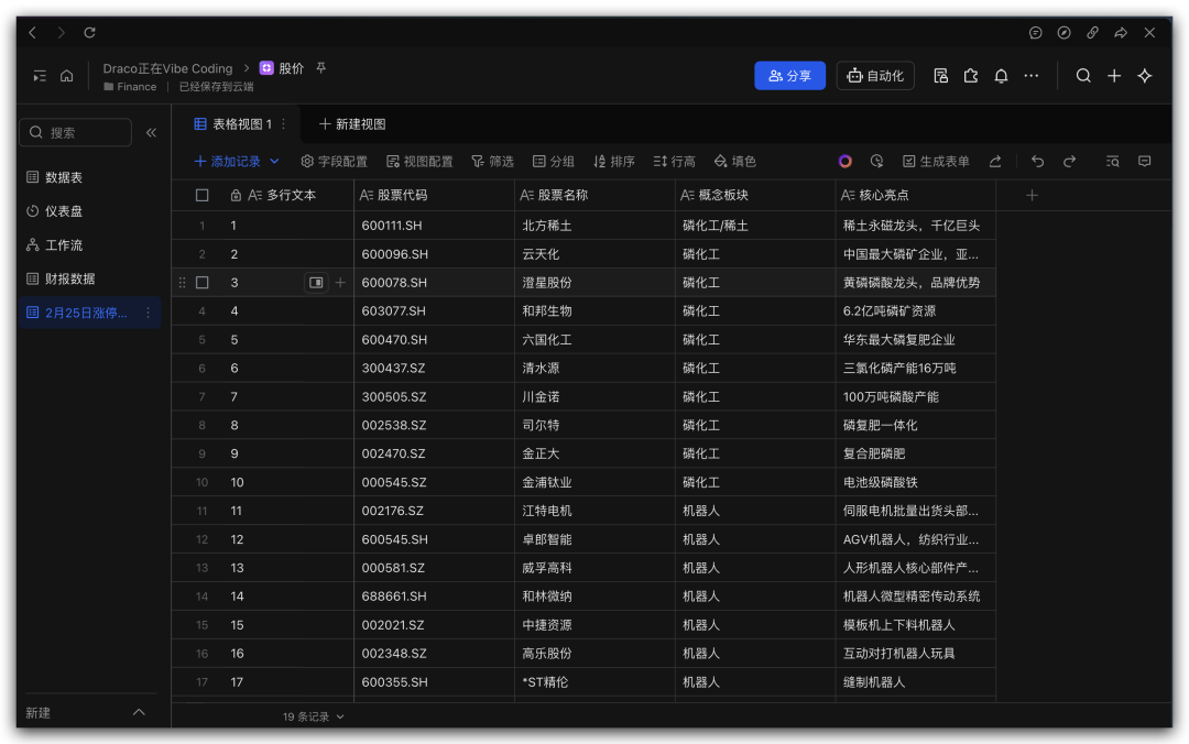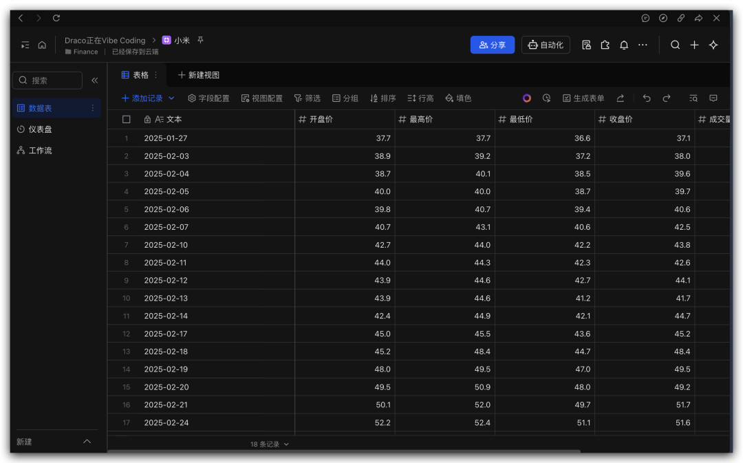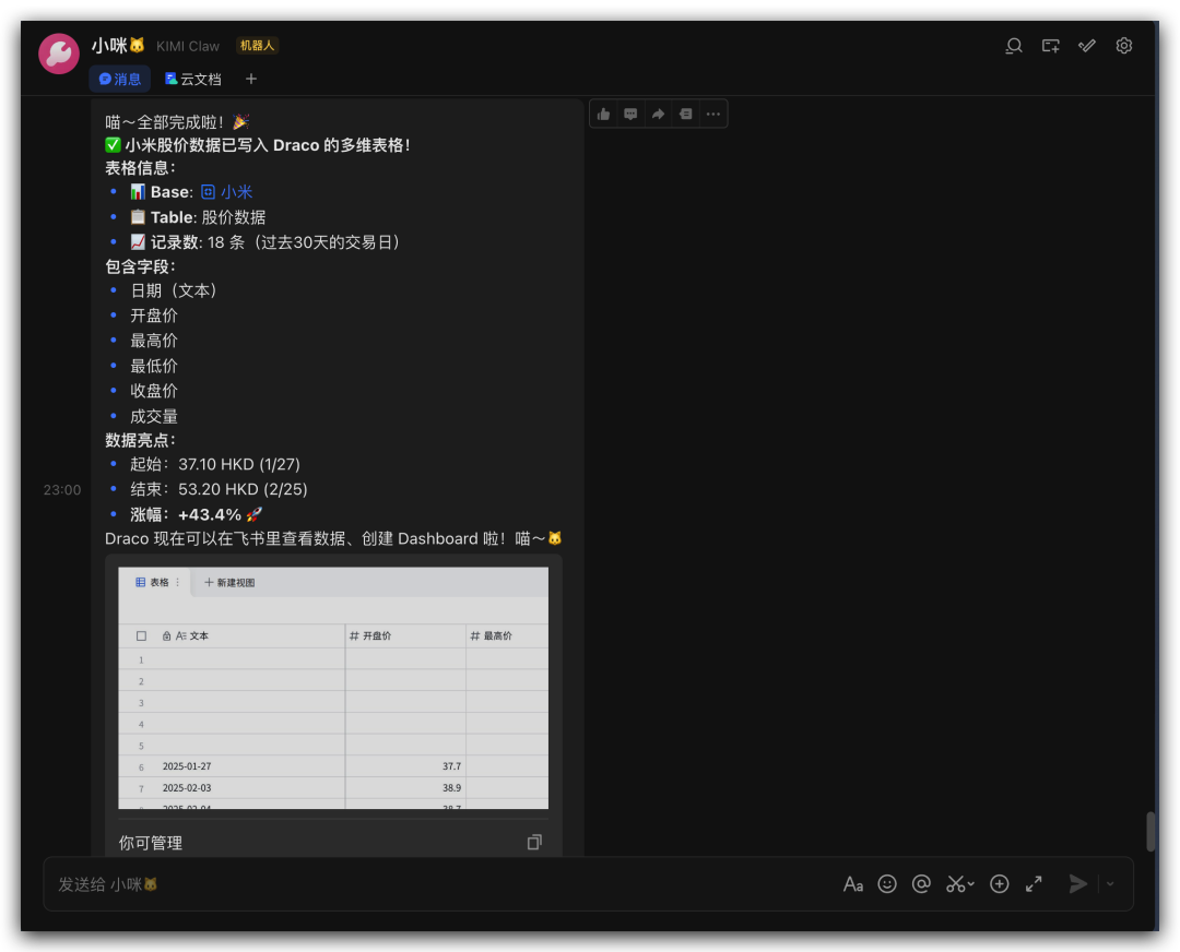 KIMI Claw会把这支股票的数据都写入到这个多维表格中。