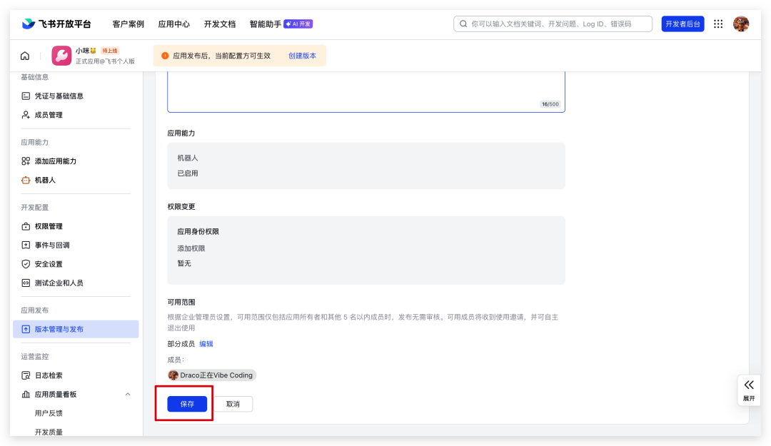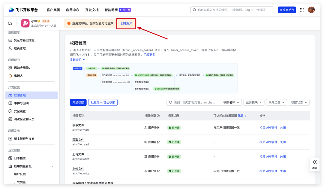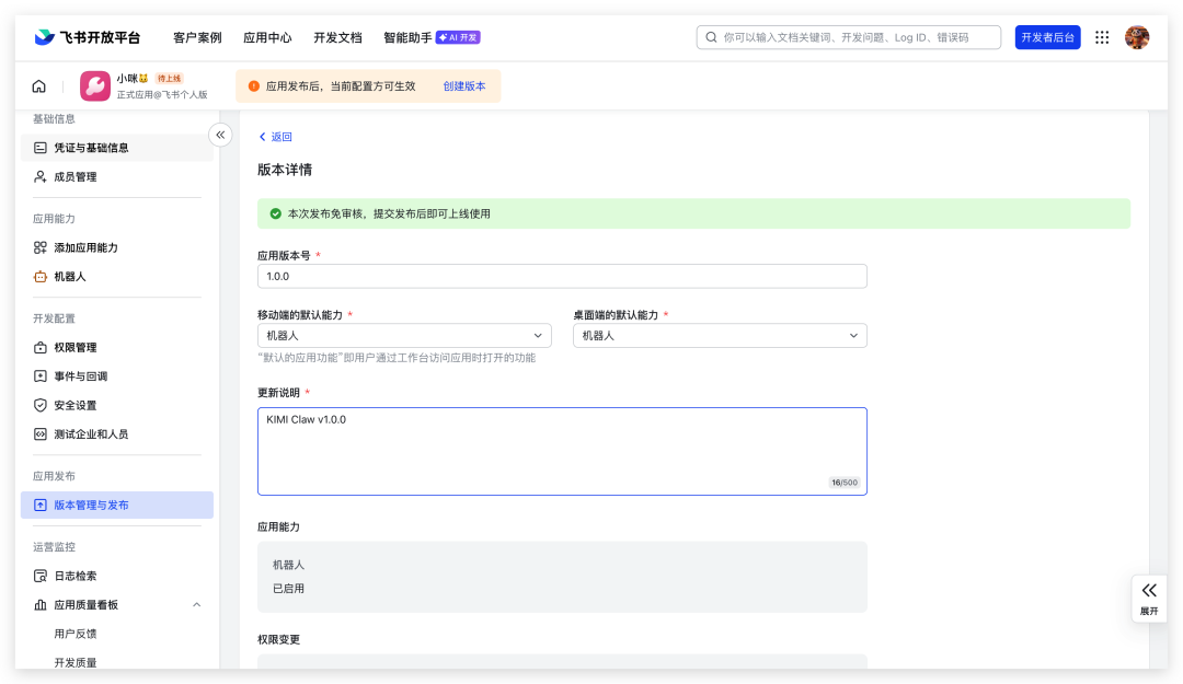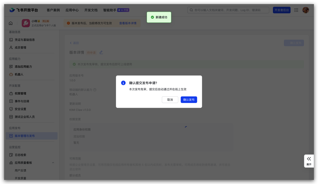 点击“创建版本”,然后确认发布。