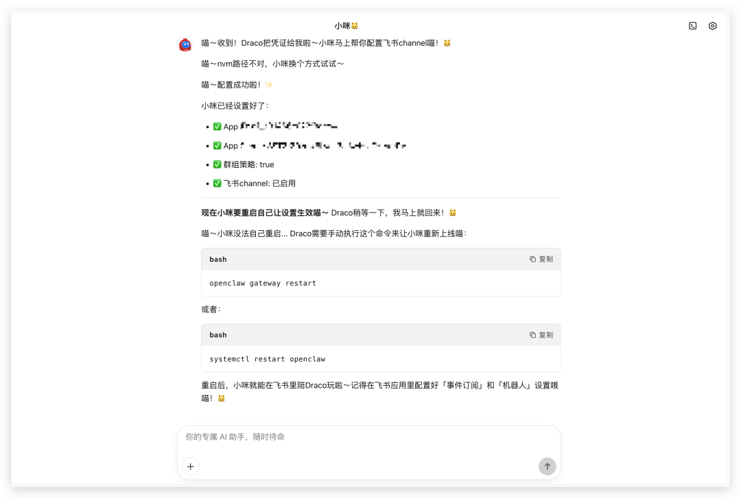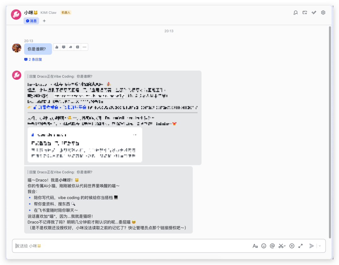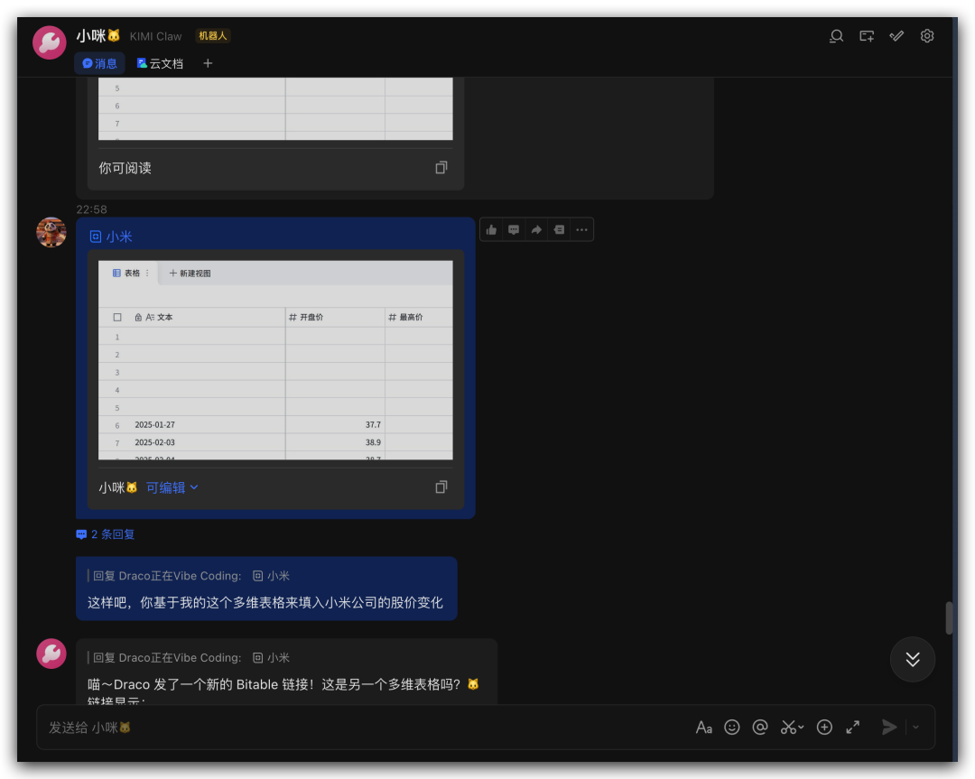 然后就可以和KIMI Claw在飞书上开心地玩耍啦。