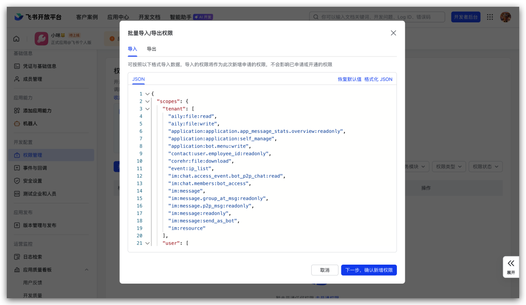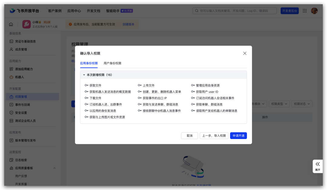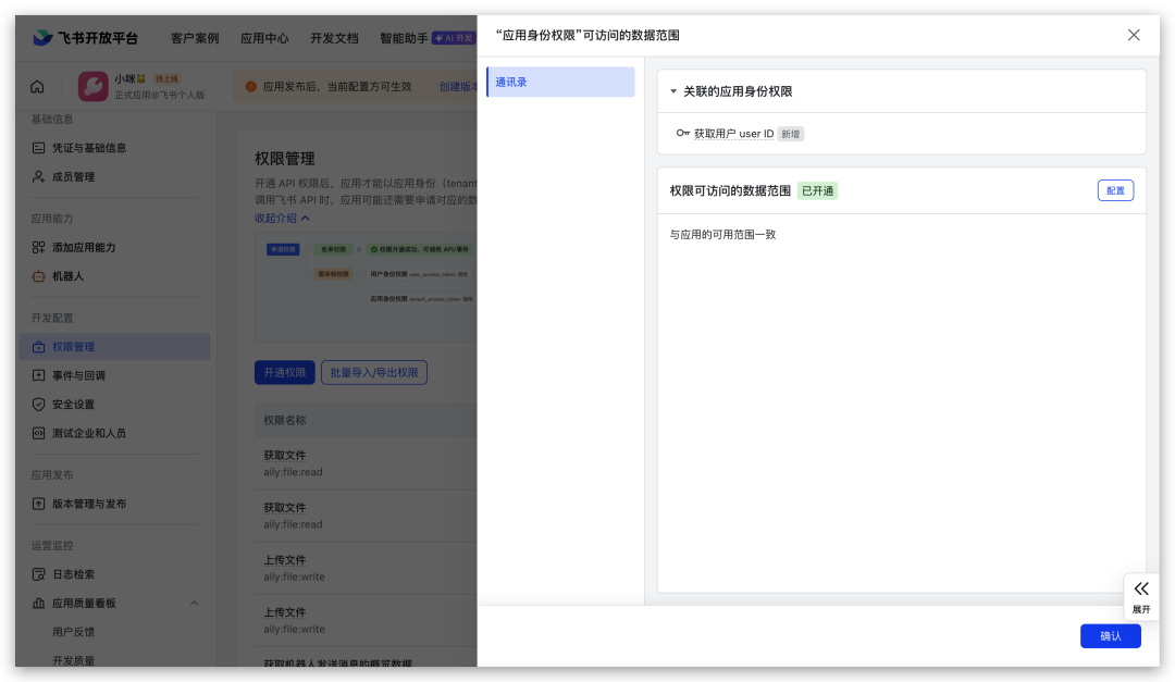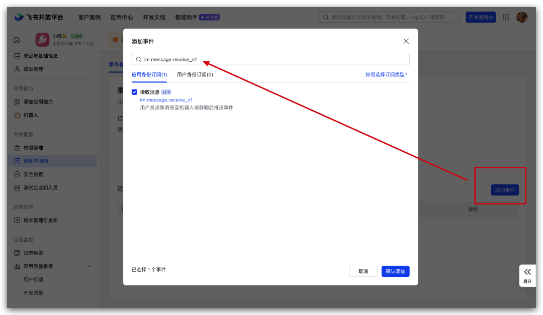 添加im.message.receive_v1(确认添加)。