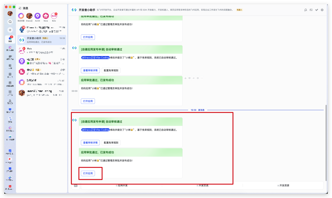 切换到飞书,找到“开发者小助手”,点击“打开应用”。