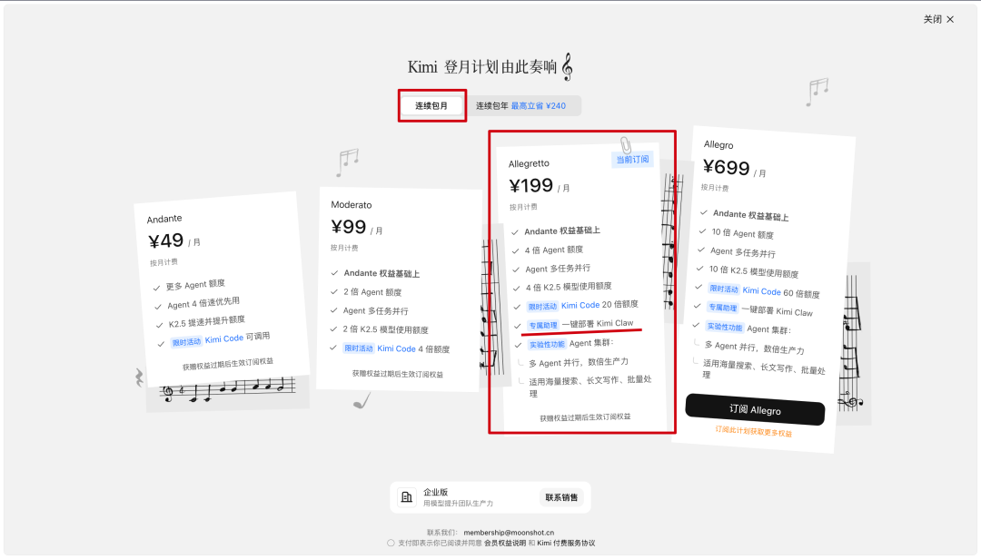 切换到连续包月选择¥199/月 的Allegretto 版本,点击“订阅”。