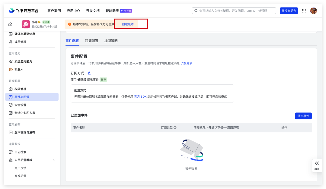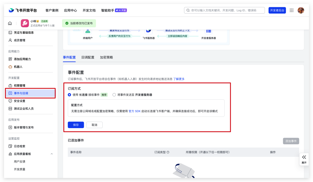 回到飞书开放平台“事件与回调”,选择“长连接”。