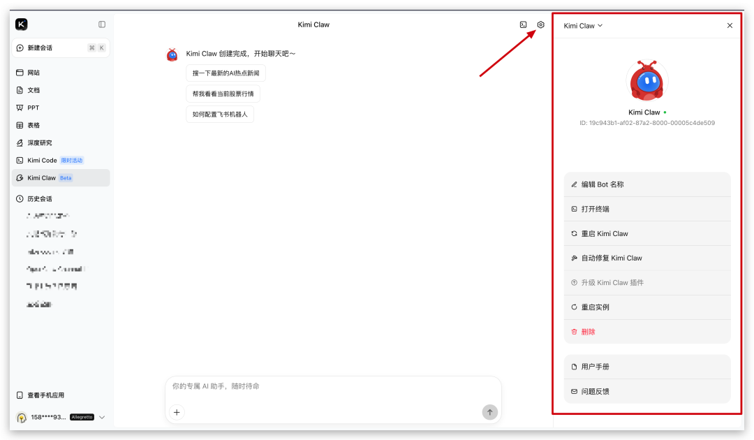 打开KIMI Claw的终端,输入openclaw gateway restart,或者在KIMI Claw的设置中选择重启KIMI Claw。