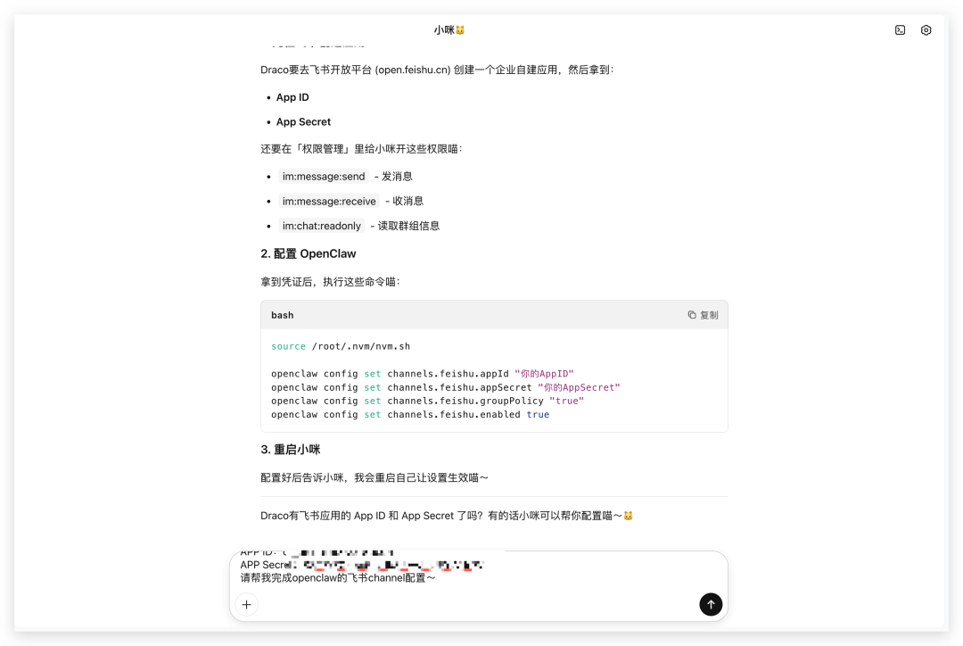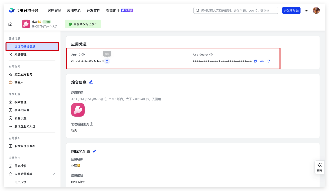 将APP ID和App Secret告诉KIMI Claw。