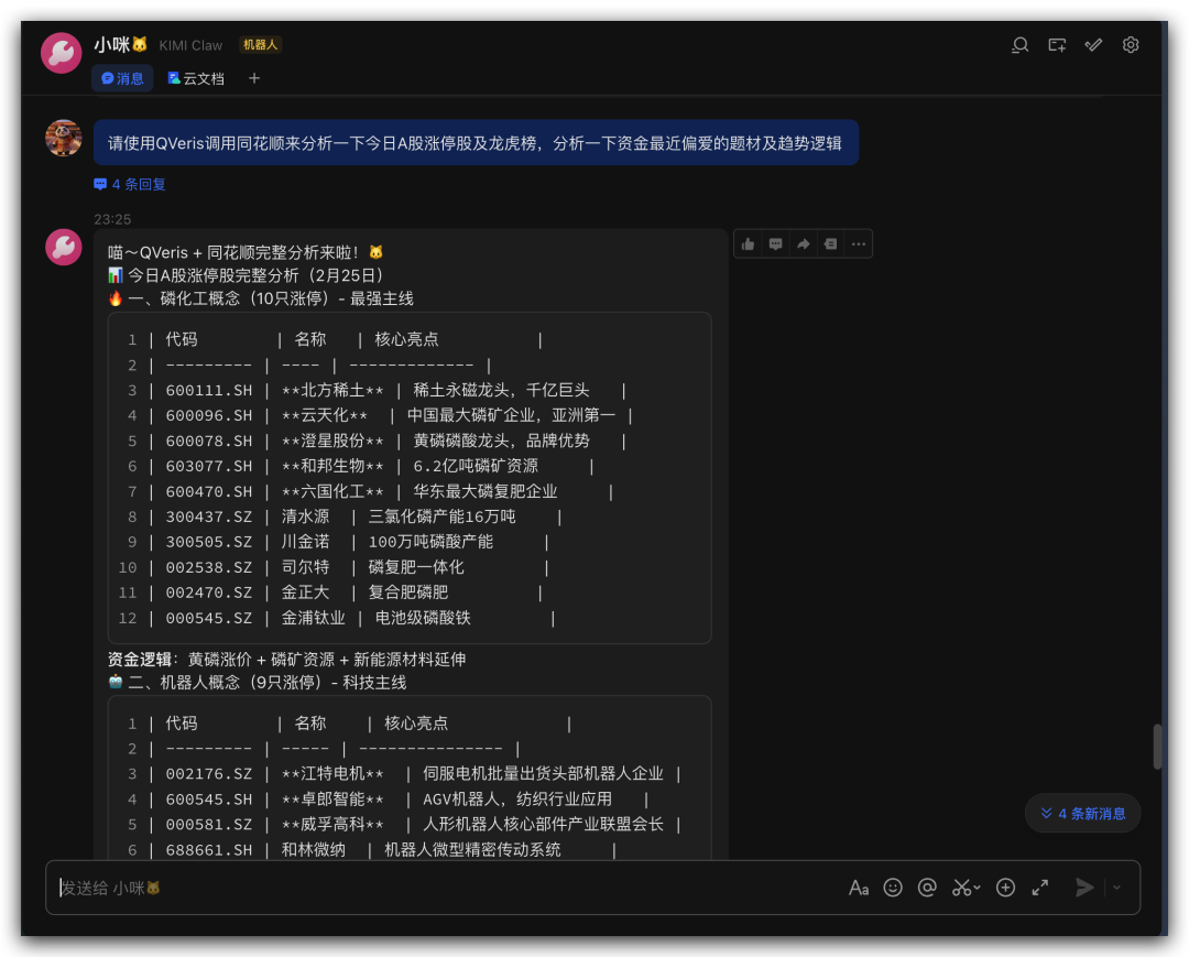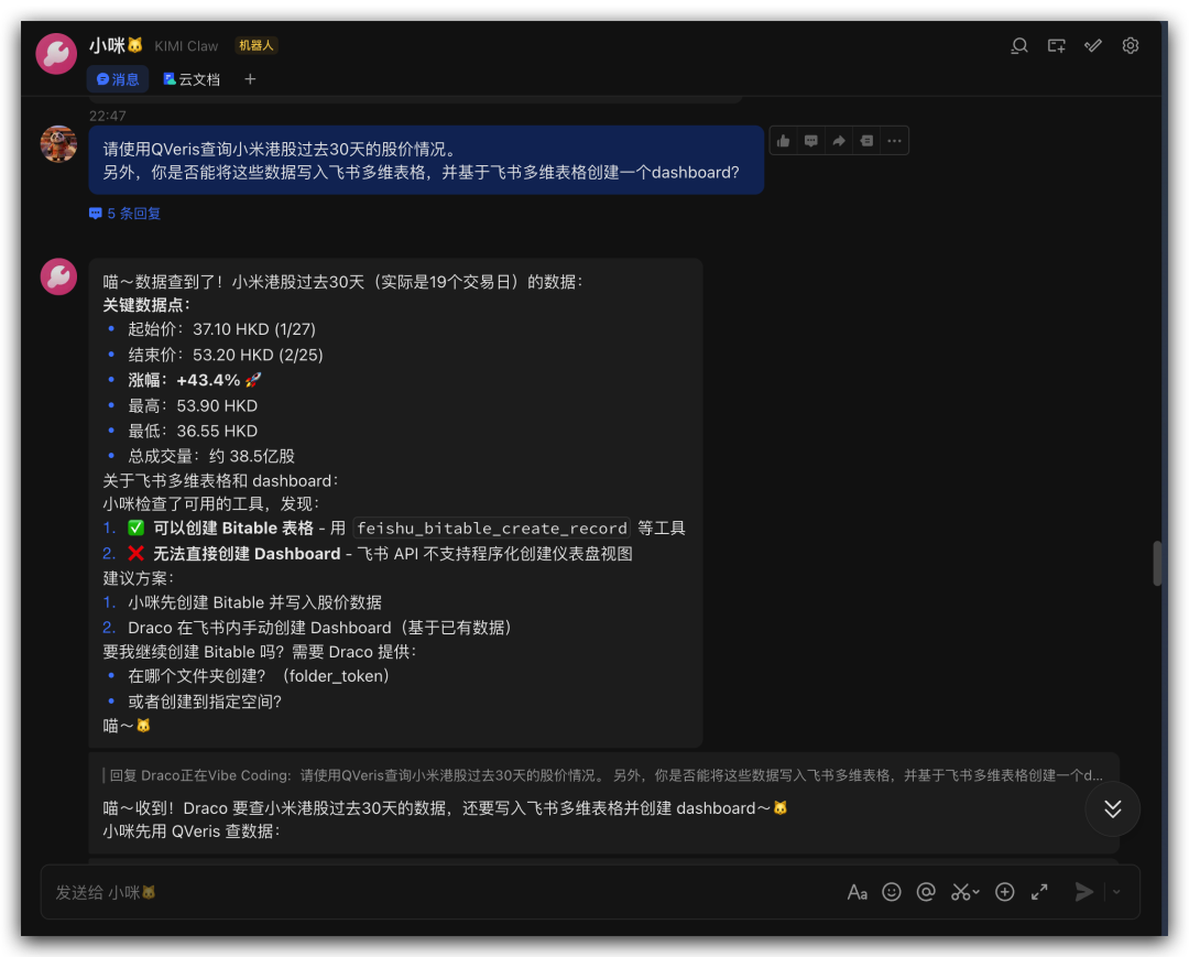 具体场景嘛,刚好最近在测几个前微软同事的创业项目QVeris,就干脆搞了个KIMI Claw+QVeris+飞书=股市盯盘助手。大概长这个样子: