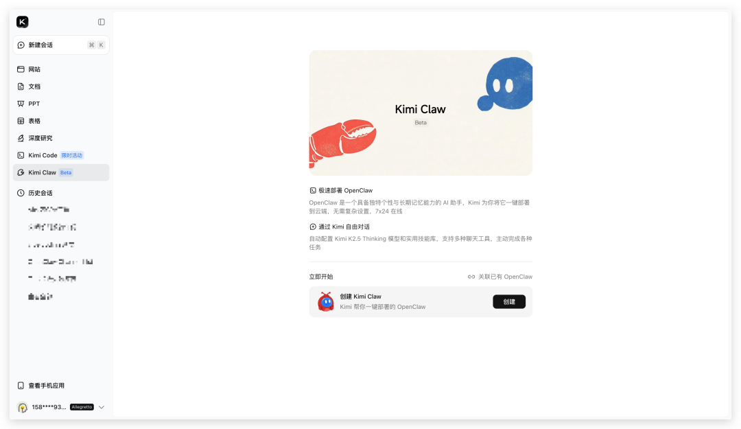 今天给大家推荐的是Moonshot(月之暗面)的KIMI Claw龙虾。为什么首先推荐Moonshot?因为你订阅KIMI Allegretto版本及以上会员(尤其是像我这种日常使用KIMI for Coding/KIMI K2.5的)相当于白领了一只龙虾嘛!毕竟自己找一台Spot Server部署龙虾一个月都得大几十¥了...