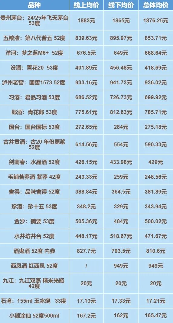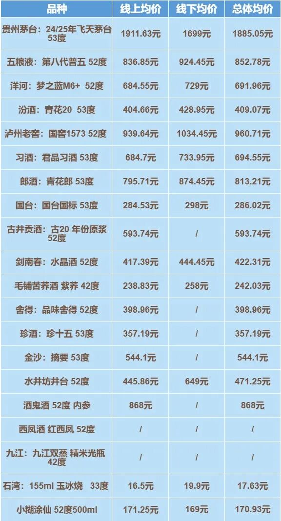 其中农历新年热销的飞天茅台,近期价格进一步走高。本期课题组统计后了解到,深圳样本终端的飞天茅台零售均价为1885.05元/瓶,其中线上平台的零售均价高达1911.62元/瓶。南都湾财社记者注意到,本次深圳的线上平台报价均不低于1700元/瓶,其中最高的为1919深圳门店,价格(已综合门店报价平均,已计算补贴等)达到2055.6元/瓶。根据深圳部分线下门店负责人反馈,飞天茅台价格持续走高,主要系产品在市场的需求依然旺盛。