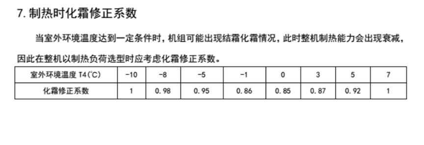 此外,另一个影响耗电的关键因素也被原视频忽视——冬季室外机结霜。冬季室外机结霜会导致空调供暖效率下降,空调需要频繁化霜。不同空调的化霜能力不同,对制热效果也会产生不同影响。为了科学衡量这种影响,技术上通常引入“化霜修正系数”。简单来说,它是一个百分比,反映了在不同室外温度下,空调由于需要分出能量和时间去化霜,导致其实际制热量相比最初设定供热能力的“打折”程度。美的空调技术手册[4]对此进行了测评,结果如下图所示。