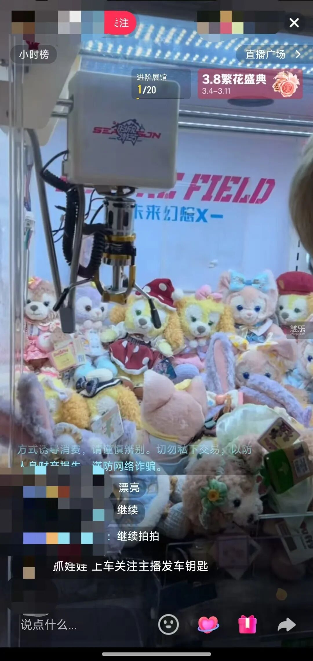 临近打烊的店里还有四五个人,看样子是店员或者老板,架着补光灯和手机支架,正对着娃娃机给直播间的观众代抓。其中一个人一边看着,一边心不在焉地抓着,嘴上喊着:“再送老板50抓!”钩子看起来就是在乱甩,因为操作娃娃机的人的注意力全部都在手机屏幕上,但她每次总能抓起几只娃娃,然后机器再把这些娃娃抛向远处。
