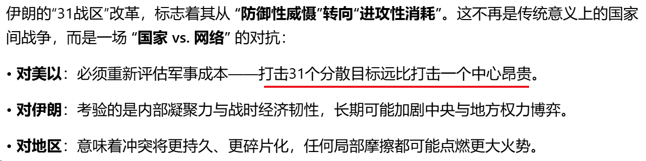 伊朗在2026年3月初进行了军事重组,将全国划分为31个独立战区,并赋予各战区指挥官高度自主决策权。这一举措是在美以联军持续“斩首”行动、伊朗指挥系统遭严重渗透的背景下推出的。要求各自为战,想怎么打都可以。